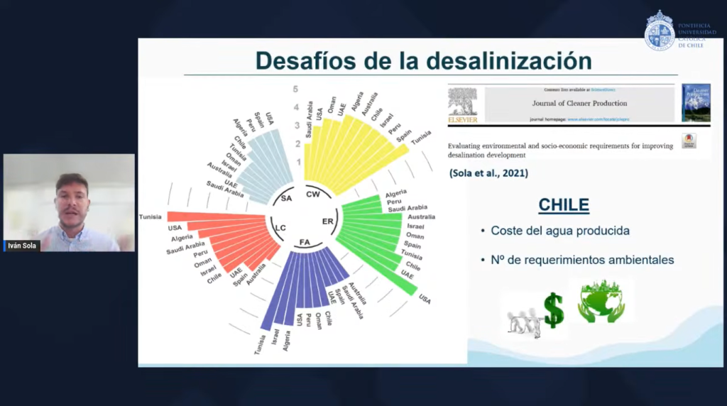 Durante su exposición, el Profesor Asistente del Departamento de Ingeniería Hidráulica y Ambiental de la Escuela de Ingeniería UC, Iván Sola, abordó los principales desafíos que enfrenta hoy la industria de la desalación, señalando que éstos varían según el contexto de cada país. En el caso de Chile, subrayó la urgencia de enfrentar el desafío socioambiental, mediante una adecuada gestión de los potenciales impactos ambientales y sociales asociados a estos proyectos.