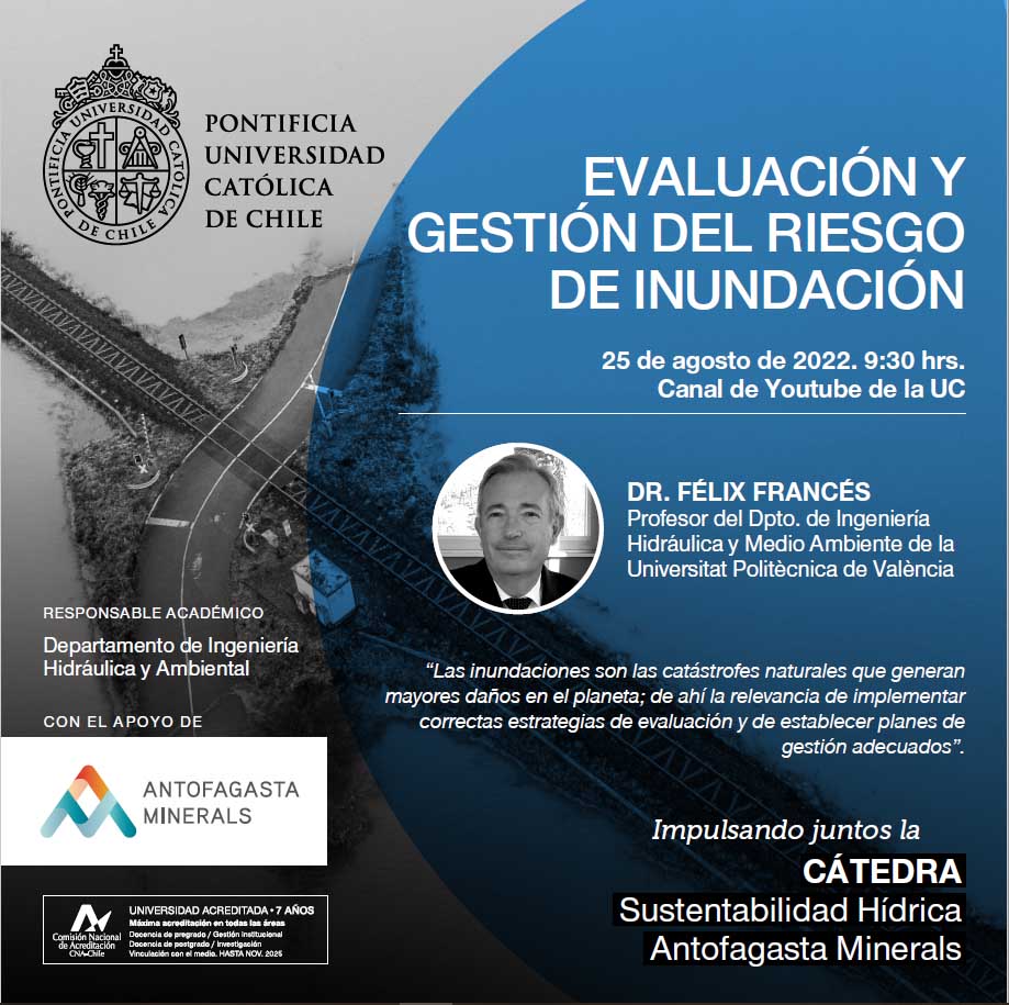 En la cuarta conferencia organizada por la Cátedra de Sustentabilidad Hídrica Antofagasta Minerals, el académico de la Universidad Politécnica de Valencia Félix Francés, explicó que las inundaciones son las catástrofes naturales que ocurren con mayor frecuencia y afectan al mayor número de personas en el planeta, y profundizó en aquellos aspectos que resultan más relevantes para realizar una adecuada evaluación y gestión del riesgo que representan.